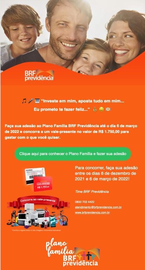 sua adesão ao Plano Família BRF Previdência até o dia 6 de março de 2022 e concorra a um vale presente no valor de R$ 1.750,00 para gastar com o que você quiser.