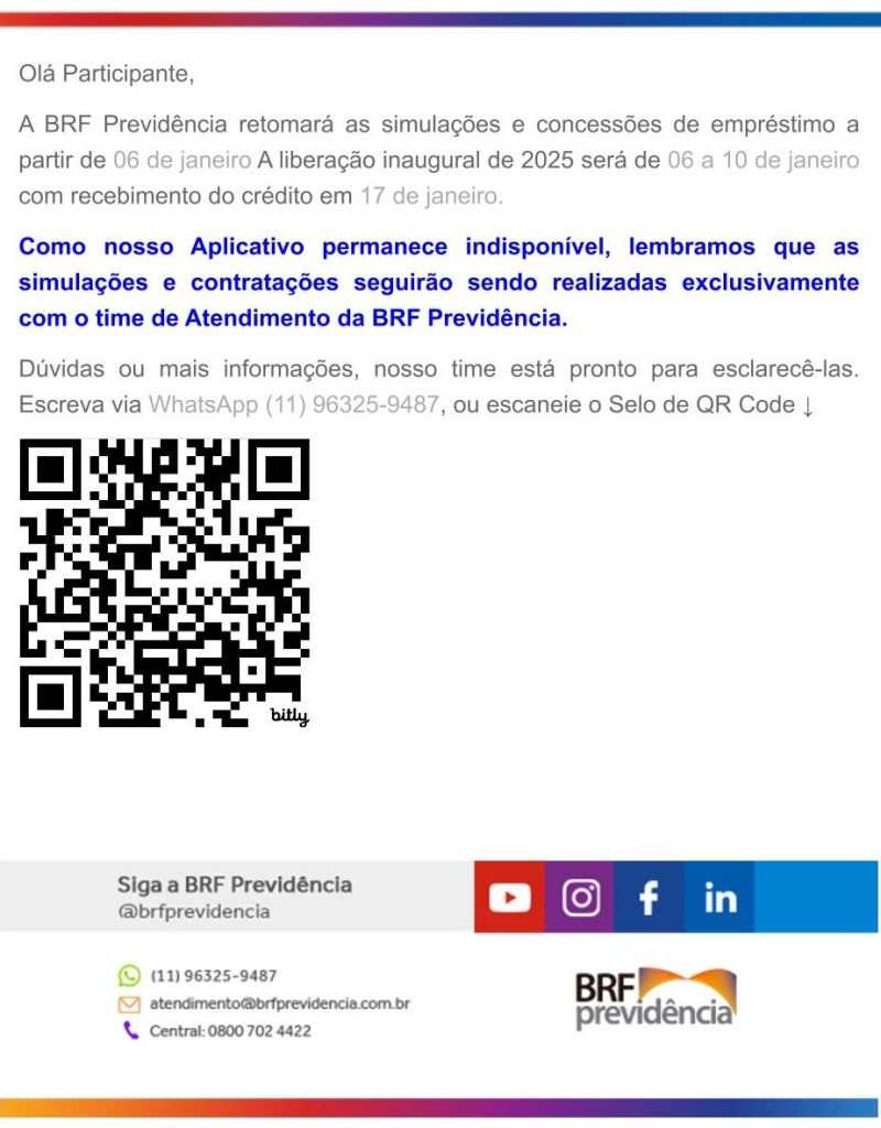 A BRF Previdência liberou aos participantes a simulação e contratação do empréstimo (contratos novos) via atendimento da BRF Prev.