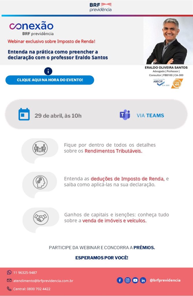 Programe-se e participe da webinar exclusiva BRF Prev sobre IR, e entenda na prática como preencher a declaração com o professor Eraldo Santos.
