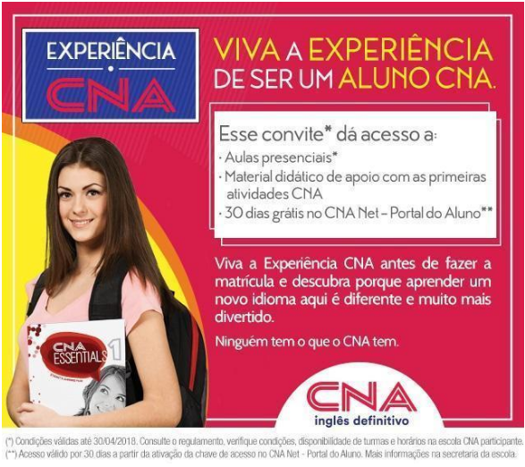 Mesmo antes da matrícula, participe das aulas presenciais e receba material didático de apoio com as primeiras atividades CNA. Acesse, também, por 30 dias grátis no CNA Net – Portal do Aluno, a partir da ativação da chave de acesso no site. Mais informações sobre o tema você poderá obter na secretaria da escola.